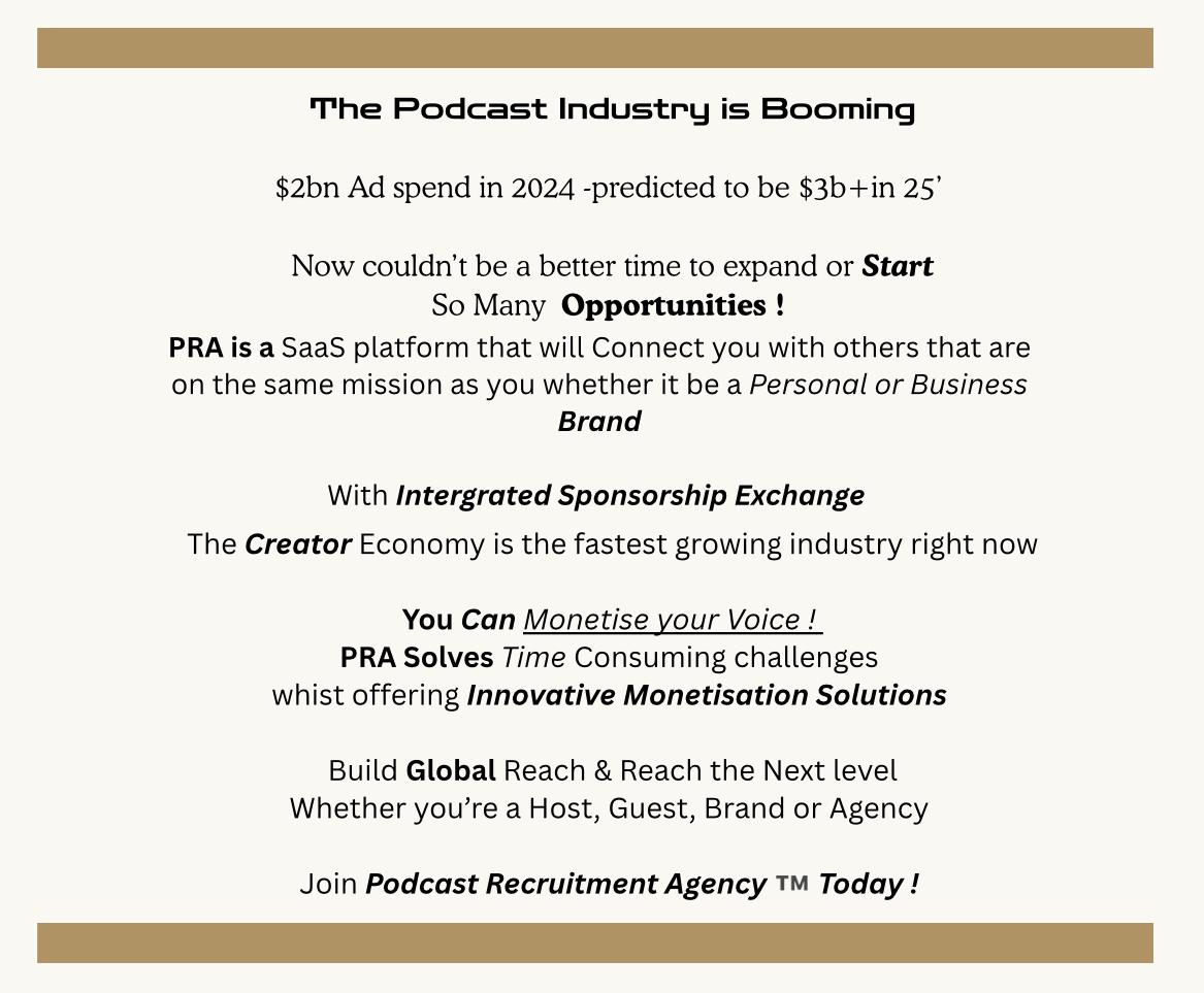 Podcast Recruitment Agency ™️ matches the right voices with the right audiences — helping podcasters recruit guests, brands source sponsorships, and guests access high-value shows. Join our Founder program or grab early access to secure priority placement and exclusive perks.